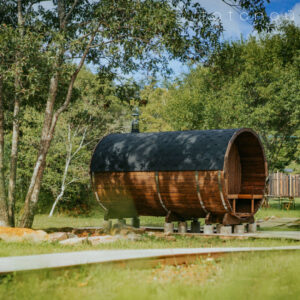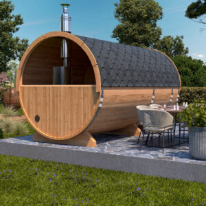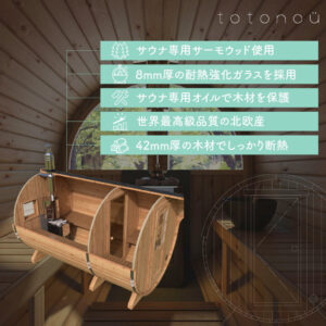 庭先や露天風呂などに設置できる樽型バレルサウナの中でも最大サイズのモデルです。内部は豊かな木の香りを楽しむことができます。暖かな木材の質感を楽しめる素材で、心が安らぐ薪ストーブを採用したモデルです。